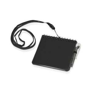 Яркий блокнот с шариковой ручкой можно носить на шее благодаря специальному ремешку (45 см). Отличный промо-сувенир, на обложку которого можно нанести логотип.
