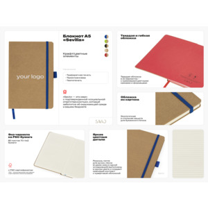 Sevilia от Savio — блокнот с твердой обложкой из крафта, закрывающийся на вертикальную резинку. Для удобства использования предусмотрены ляссе и петелька для ручки, совпадающие по цвету с резинкой. Бумажный блок выполнен из бумаги, полученной из древесины из специальных восполняемых лесных ресурсов, имеет сертификат FSC, международной некоммерческой организации лесного попечительского совета. Линовка — линия, выполнена специальными экочернилами, при изготовлении которых используется меньшее количество энергии. - 80 листов - твердая обложка обеспечивает защиту бумажного блока и прочность конструкции - бумага из восполняемых лесных ресурсов - петелька для ручки - экочернила - ляссе обложки для быстрой навигации