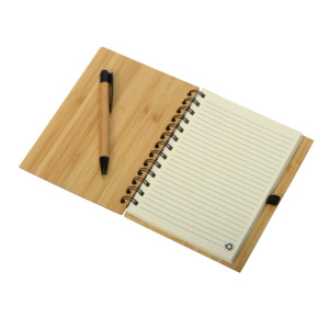 Набор с блокнотом и ручкой изготовлен из экологически чистых натуральных материалов. Обложка блокнота и корпус ручки из натурального бамбука, листы из переработанной бумаги.