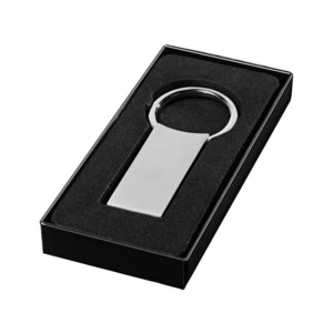 Прямоугольный брелок. Классический брелок со скрытой застежкой. Металлический брелок серебристого цвета может дополнить подарочный набор для партнеров по бизнесу. На брелок можно нанести логотип и наименование организации.