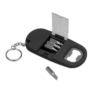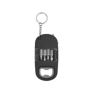 Брелок включает в себя 2 плоские и 2 крестообразные насадки и прочную металлическую открывалку. Корпус сделан из плотного пластика с мягким покрытием soft-touch. Встроенный фонарик позволяет подсвечивать рабочую зону.