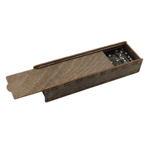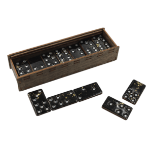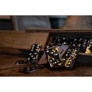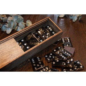 Домино WIN-WIN в стильном деревянном пенале, входит в коллекцию "Русские сезоны". Кости глянцевого черного цвета из дерева и ювелирной смолы с золотыми вкраплениями и стразами произведены вручную. Элегантный и лаконичный дизайн.