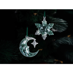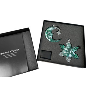 Набор из 2-х елочных игрушек: в форме месяца и снежинки. Игрушки выполнены из ювелирной эпоксидной смолы и украшены галтовкой из натуральных минералов. Игрушки бережно упакованы в картонную коробку с внутренним вкладышем, который надежно фиксирует их внутри. Для вашего удобства к каждой игрушке прилагается элегантная ленточка, с помощью которой вы легко сможете подвесить их на ёлку.