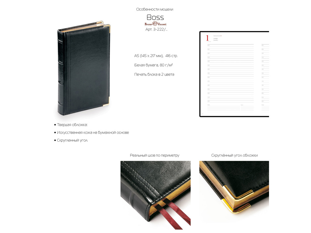 Полудатированный ежедневник «Boss» от бренда Bruno Visconti - это качественный корпоративный подарок по выгодной цене, произведенный специально под персонализацию. Представлен в универсальном формате А5 и состоит из 416 страниц. Классический деловой ежедневник линии Boss – образец элегантности. Гладкую тонкую фактуру экокожи подчеркивает декоративная строчка по контуру и металлические закругленные уголки золотистого цвета. В ежедневнике есть полезная справочная информация и телефонная книга, а также страницы для записи идей, мыслей и составления рабочих планов. Есть перфорация (нижние уголки отрывные). Для изготовления страниц используется качественный бежевый офсет повышенной плотности (80 г/кв м), которая производится японской фирмой "Daiwa" и подходит для всех видов чернил. Ежедневник можно персонализировать с помощью тиснения обложки - золотой или серебряной фольгой. Наши ежедневники помогут быть успешным и эффективным в карьере и повседневной жизни!