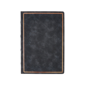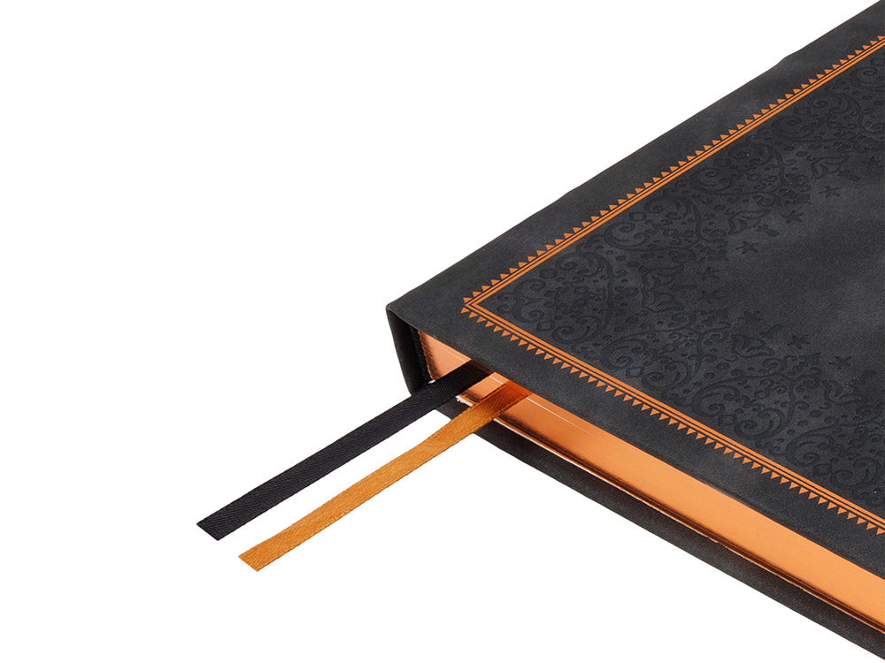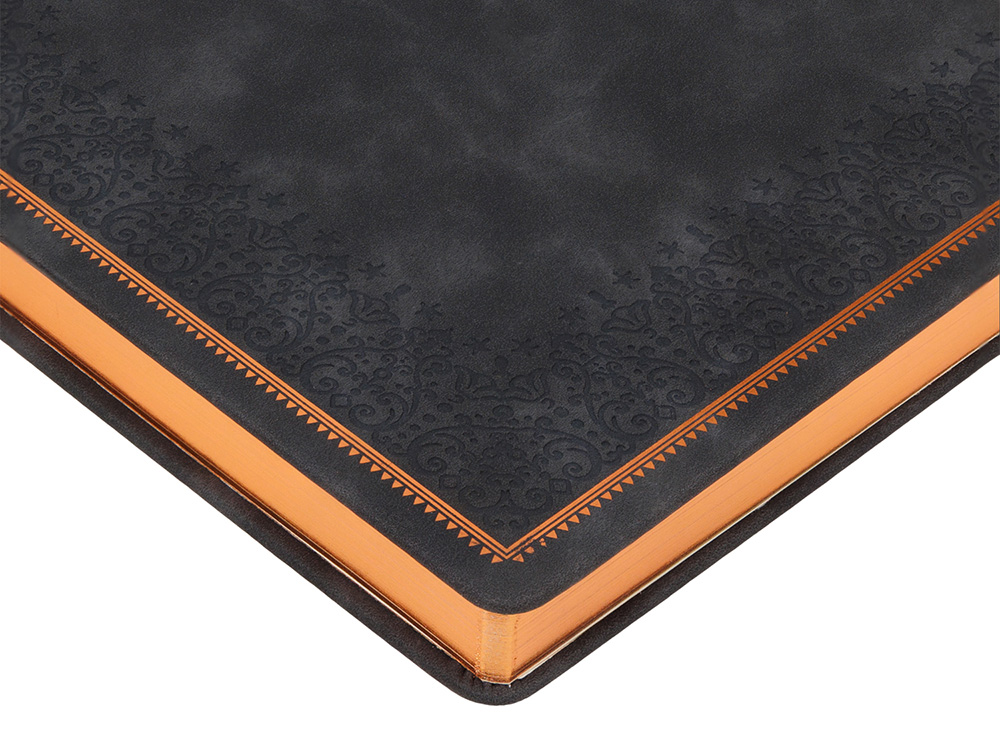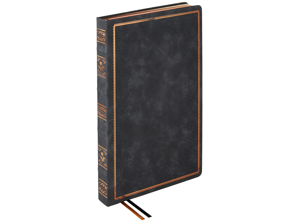 Недатированный ежедневник "Royal" формата А4 с твердой обложкой из искусственной кожи с имитацией нубука украшен художественным бронзовым и блинтовым тиснением. Внутри 192 страницы, выполненные из качественной бежевой бумаги в линейку плотностью 140 г/м². Два шелковых ляссе в цвет обреза блока и обложки облегчают навигацию по записям. Французский корешок дополнительно декорирован изящным бронзовым тиснением в виде виньеток. Скругленные углы обложки и блока подчеркивают стильный дизайн изделия, а блеск бронзового обреза дарит ежедневнику благородный и роскошный внешний вид.