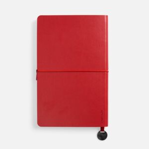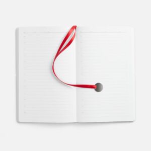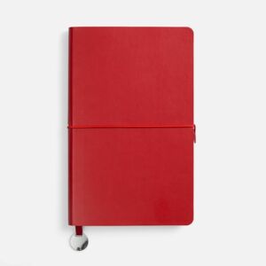 Ежедневник с гибкой обложкой, выполнен из материала Waltz, красный РР, дополнен ляссе в цвет обложки с металлическим шильдом.
