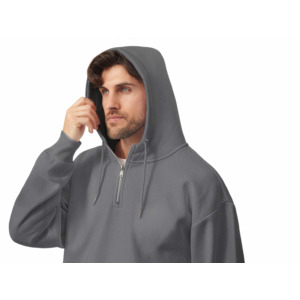 Худи с капюшоном ворот на молнии. Шнур в капюшоне с металлическими наконечниками. Отделка горловины спинки внутри тесьмой, Риб 2х2 по низу изделия и манжетам. Удобный карман кенгуру.