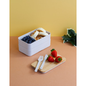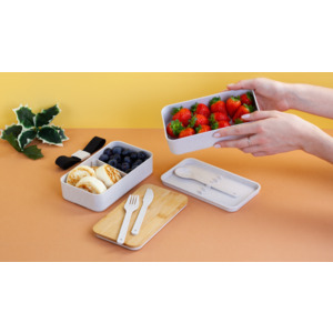 Простой, удобный и вместительный контейнер имеет два отделения и столовые приборы в комплекте. Кроме того, имеется эластичная стяжка для удобной и безопасной переноски.