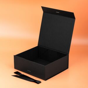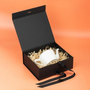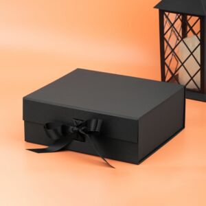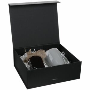 Коробка из переплетного картона, кашированного тонированной в массе крафтовой бумагой. Крышка на двух магнитах дополнительно фиксируется лентой.Толщина картона 2 мм.