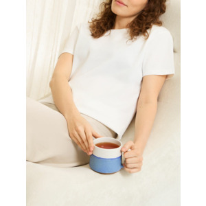 Нижняя половина кружки покрыта реактивной глазурью — особым видом керамического покрытия, компоненты которого вступают в химическую реакцию во время обжига при температуре 1200°C и выше. Из-за непредсказуемого взаимодействия компонентов создаются уникальные переливы, узоры и текстуры, поэтому в партии невозможно найти два абсолютно одинаковых изделия.Емкость 520 мл.
