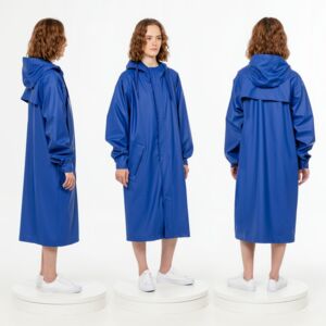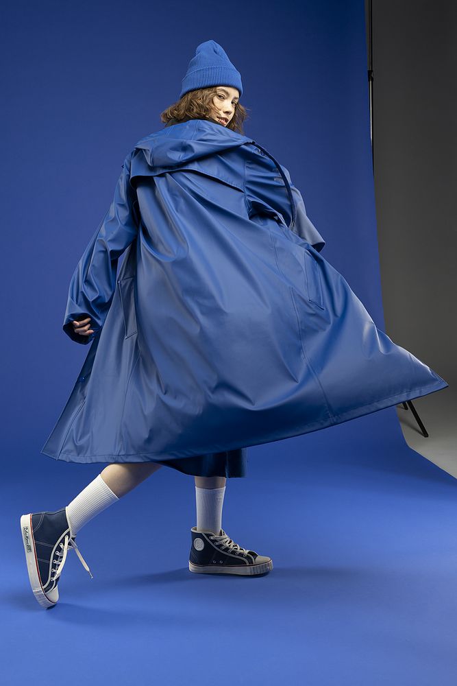 Плащ-дождевик с капюшоном из полиэстера с полиуретановым непромокаемым покрытием.