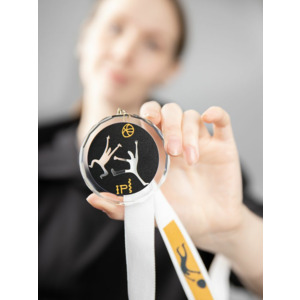 Медаль изготовлена из стекла К9, в основе которого лежит оптическое боросиликатное стекло. Эту марку стекла отличает низкий процент посторонних включений, высокий показатель преломления и высокая прозрачность — идеальные качества для изготовления наград премиального уровня.