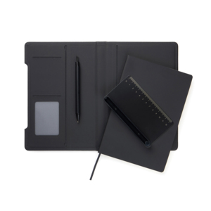 Изготовлен из переработанной бумаги, сертифицированной по стандарту RCS, с обложкой в классическом стиле Baltimore с матовым PU-покрытием, что делает его не только функциональным, но и визуально привлекательным. Магнитная линейка служит одновременно и линейкой, и держателем для ручки. Шариковая ручка в цвет набора с синими чернилами входит в комплект. Держатель для ручки легко трансформируется в подставку для телефона. Внутри обложки есть кармашки для карт, а блокнот легко заменить новым блоком, когда закончится старый.