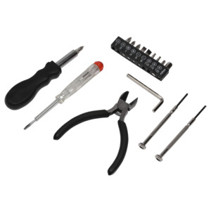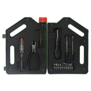 Набор инструментов в футляре в виде канистры включает в себя 1 тестер напряжения, 1 пару плоскогубцев, 1 шестигранный ключ, 1 рукоятку, к которой можно крепить отвертки, 2 прецизионные отвертки, 1 крестообразную головку, 1 плоскую головку, 10 бит.