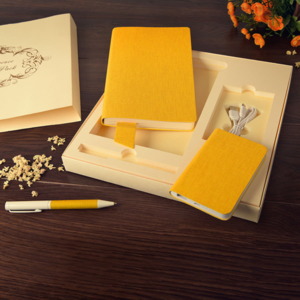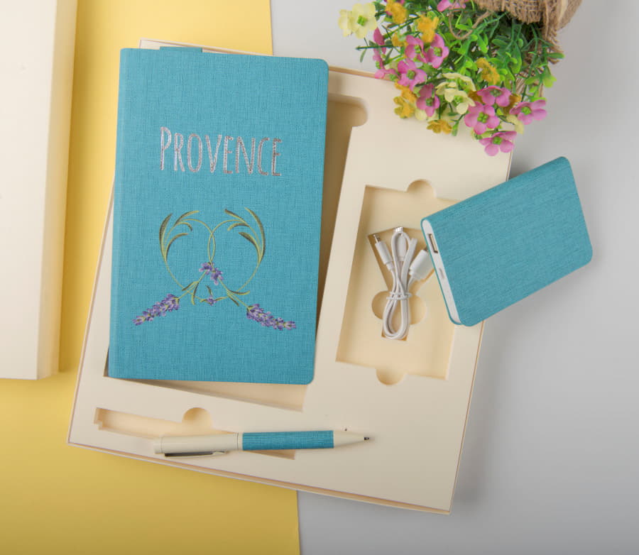 Подарочный набор PROVENCE 1) Универсальное зарядное устройство PROVENCE 5000 mAh 2) Бизнес-блокнот Provence, формат А5, в клетку 3) Металлическая ручка Provence 4)Коробка из дизайнерского картона Торито, 260 гр, слоновая кость, тиснение лен. Внутри ложемент из изолона, кашированный бумагой Торито, слоновая кость, тиснение лен.