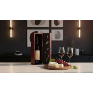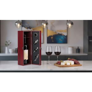 Готовый сет представлен в лаконичном деревянном футляре. Бутылка отличного вина в подарок достойна красивого оформления!
