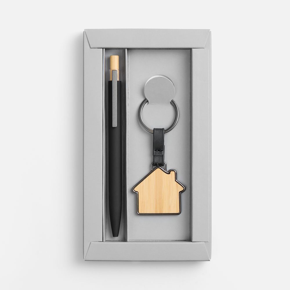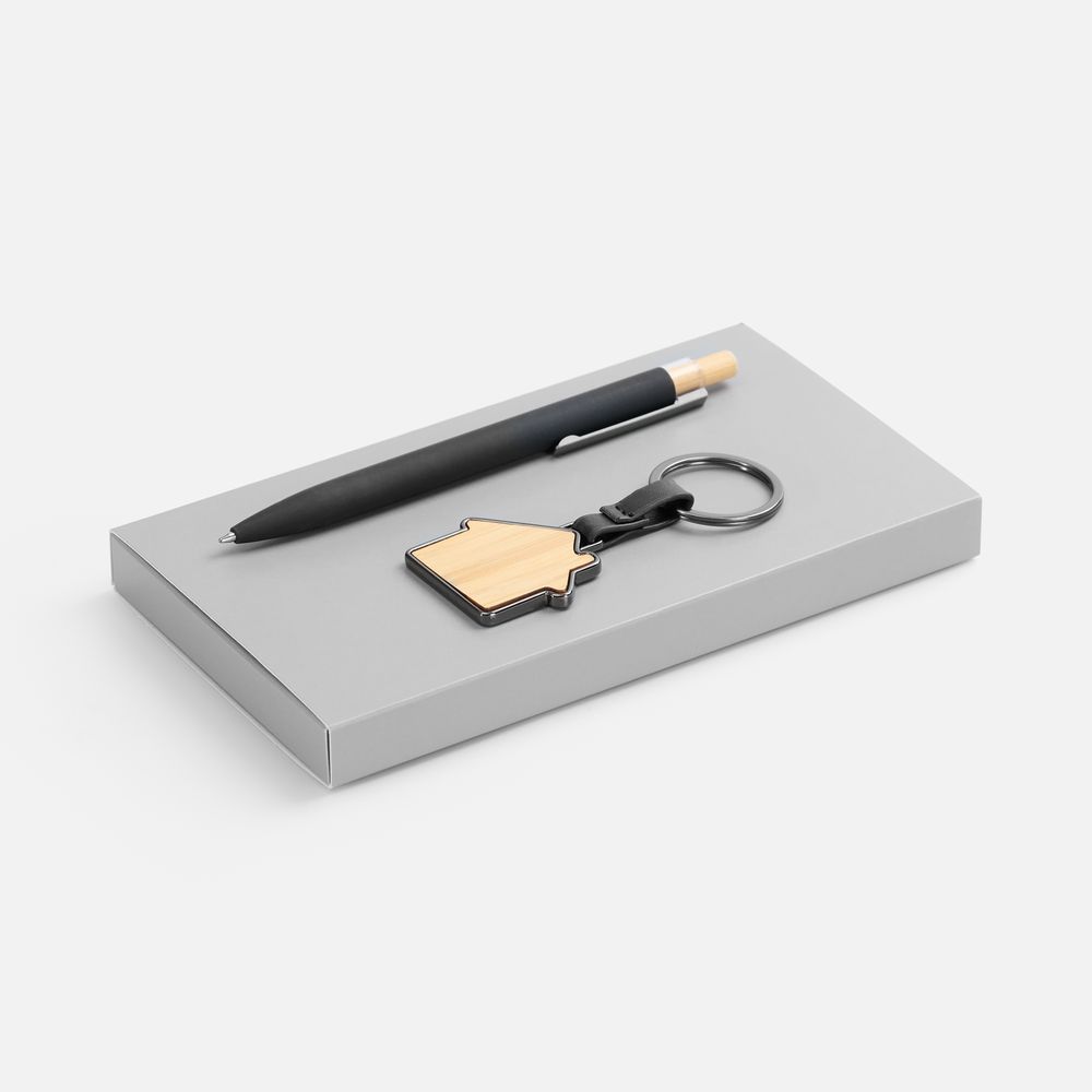 - Материал: брелок - металл; бамбук; ручка - металл, алюминий, кнопка - бамбук; коробка - картон