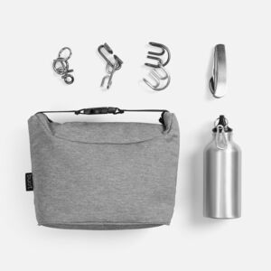 Нержавеющий столовый прибор выручит при желании перекусить вне дома или офиса, термосумка сохранит еду теплой, а прочная алюминиевая бутылка — напиток горячим. Все необходимое всегда под рукой. А чтобы перезагрузить голову, добавлена увлекательная головоломка — источник свежих идей.Емкость бутылки 400 мл.