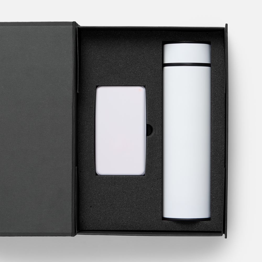 - Материал: аккумулятор - пластик; покрытие софт-тач; термос - нержавеющая сталь, 304; покрытие софт-тач; коробка - переплетный картон