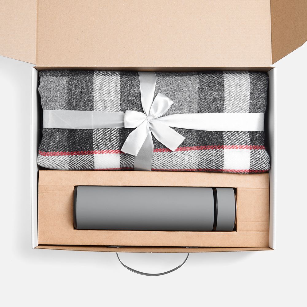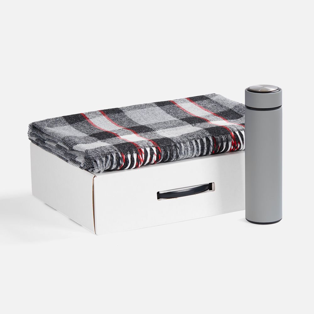 - Материал: плед - шерсть, 15%; хлопок, 5%; полиэстер 60%; акрил, 20%, плотность 200 г/м²; термос - нержавеющая сталь, 304; покрытие софт-тач; коробка - картон