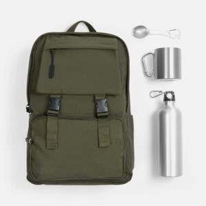 - Материал: рюкзак - нейлон; кружка - пищевая сталь, 304, внутри - нержавеющая сталь, 201; бутылка - алюминий; столовый прибор - нержавеющая сталь, 420