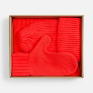 В набор входят удобный шарф с технологичным отверстием для быстрого завязывания, шапка с двойным отворотом и теплые двухслойные варежки с широкой манжетой. Все изделия связаны из акриловой пряжи, отличаются практичностью и элегантной простотой.