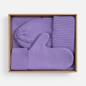 В набор входят удобный шарф с технологичным отверстием для быстрого завязывания, шапка с двойным отворотом и теплые двухслойные варежки с широкой манжетой. Все изделия связаны из акриловой пряжи, отличаются практичностью и элегантной простотой.