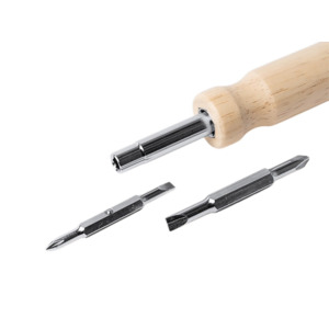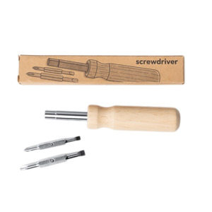 Отвертка из нержавеющей стали с круглой деревянной ручкой. В комплекте две биты с 2 насадками под крестовую и плоскую отвертки.