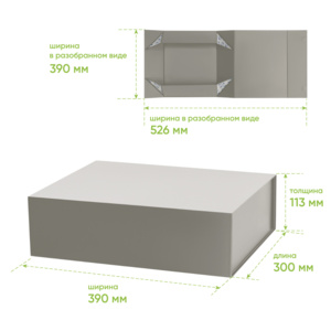 Идеальные размеры для оформления подарочных и брендовых наборов. Простая и надежная сборка без лишних усилий. В сложенном виде коробка занимает минимум места, что значительно сокращает расходы на хранение и логистику.