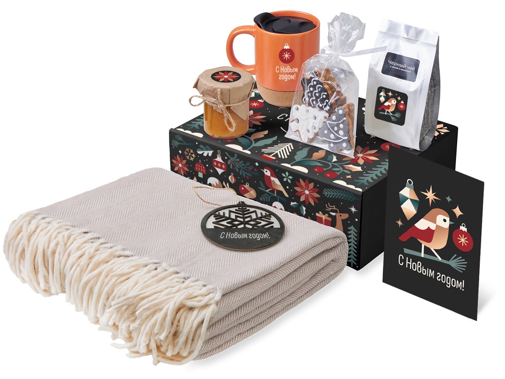 - Материал товара - плед - 100% хлопок; кружка - керамика, пробка; подвеска - дерево; открытка - бумага