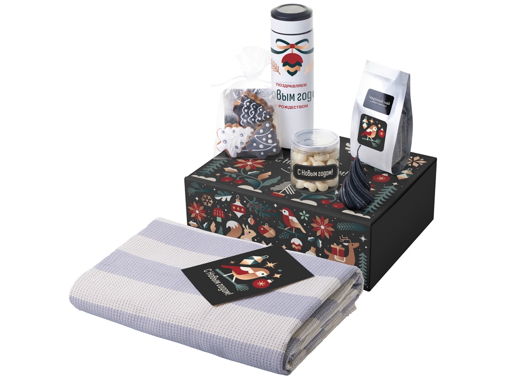 - Материал товара - плед - 100% хлопок, мешок - нетканый материал (спанбонд), термос - нержавеющая cталь с покрытием soft-touch, открытка - бумага
