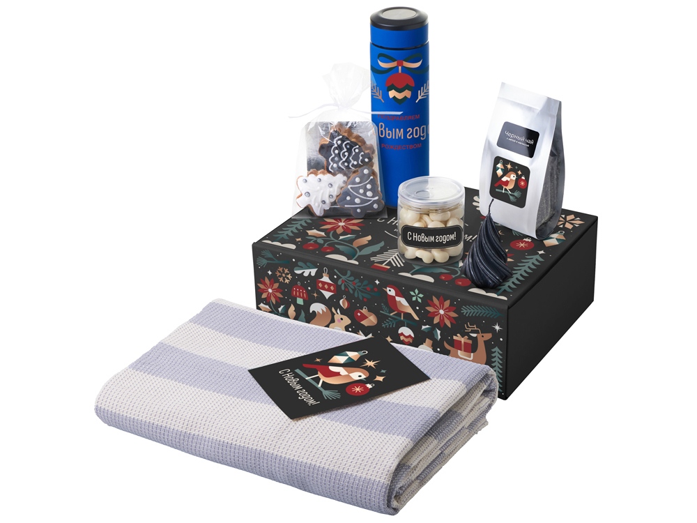 - Материал товара - плед - 100% хлопок, мешок - нетканый материал (спанбонд), термос - нержавеющая cталь с покрытием soft-touch, открытка - бумага