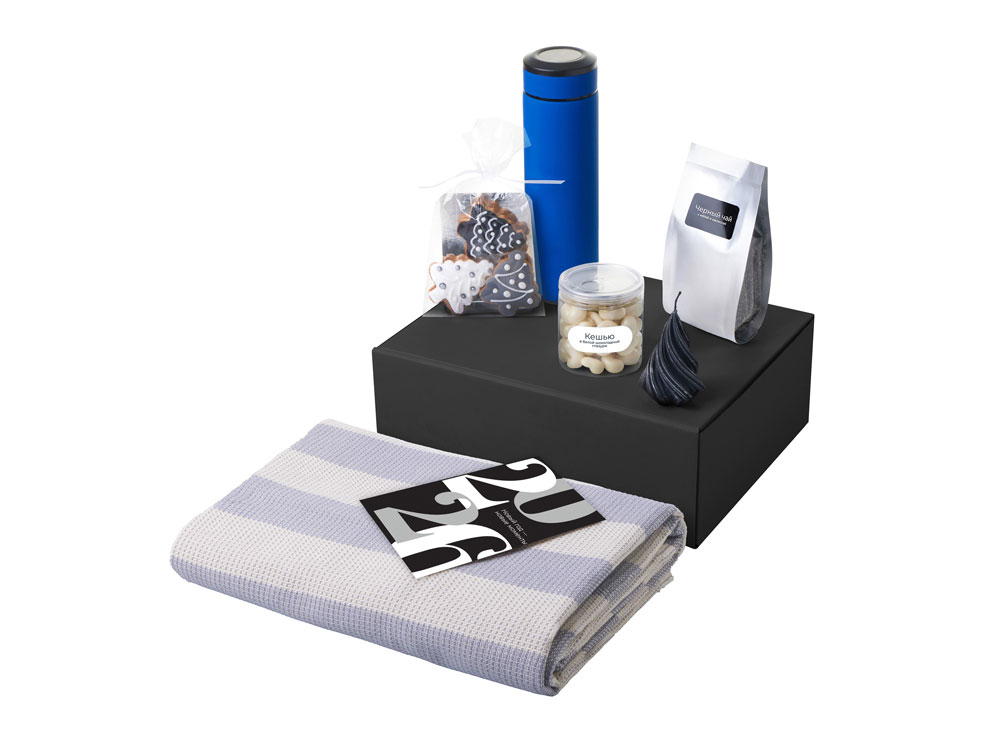 Подарочный набор c пледом, термосом, свечой и миндалем, синий