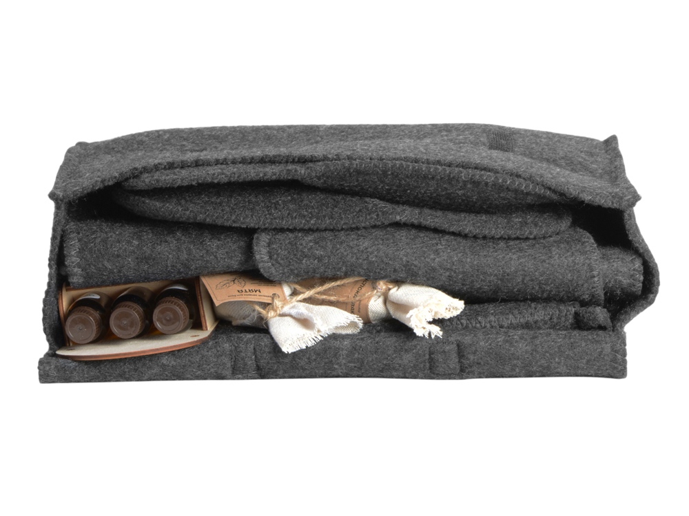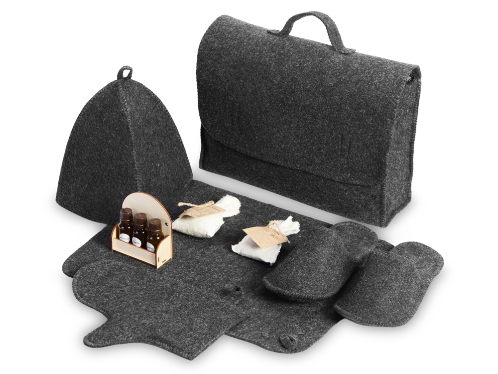 Банный набор ""Healing"" – идеальный выбор для тех, кто ценит качественный отдых и стремится к расслаблению и восстановлению в атмосфере традиционной русской бани. Выполненный в благородном графитовом цвете, набор сочетает стиль и функциональность, а его комплектация позволяет насладиться всеми этапами банного ритуала. Материал: войлок (30% шерсть, 70% полиэфир) – обеспечивает теплоизоляцию и комфорт, устойчив к воздействию влаги и температур. Цвет: графит, нейтральный и стильный оттенок, подходящий для любого интерьера. Комплектация: Портфель – удобный и стильный чехол для хранения и переноски всего набора. Запарка с мятой – добавит свежий аромат и усилит оздоровительный эффект парной. Это настой, которым поливают камни в банной печи или для запарки банных веников. Фитосбор с успокаивающим эффектом – травяной сбор для запарки, который помогает расслабиться и снять напряжение. В составе душица, мята, мелисса и репешок. Набор из трех аромамасел: Пихта – добавляет хвойный, освежающий аромат. Мята – помогает расслабиться и снимает усталость. Апельсин – поднимает настроение и добавляет нотку свежести. Масла расположены на деревянной фанерной подставке. Коврик – обеспечивает комфортное положение для ног в парной, защищая от перегрева. Шапка – традиционный банный аксессуар, защищающий голову от перегрева. Тапочки – лёгкие и удобные, идеально подходят для передвижения по парной. Рукавица – необходимый элемент для безопасного обращения с горячими предметами. Рекомендуется ручная стирка при 30°C с использованием специальных средств для шерсти или мягкого мыла.