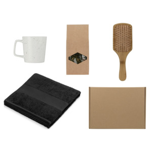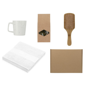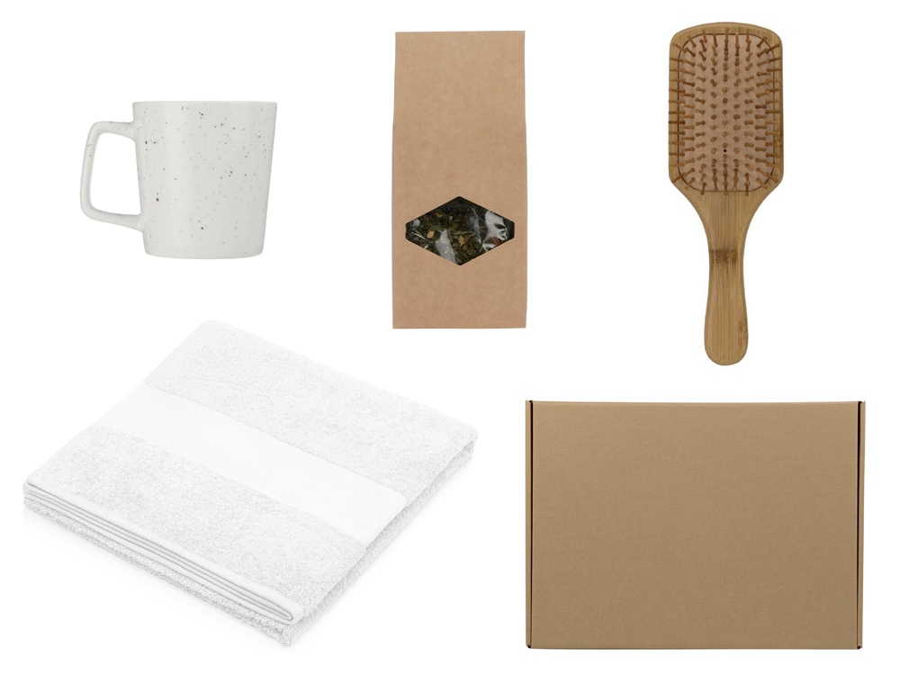 - Материал товара - полотенце - 100% хлопок, расческа - бамбук, чай - картонная упаковка, кружка - костяной фарфор, коробка - картон