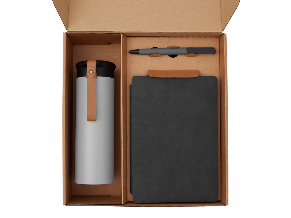 - Материал товара - термос - нержавеющая сталь, soft-touch, блокнот - термо PU с зернистой структурой, ручка - пластик с покрытием soft-touch, стикеры - смола