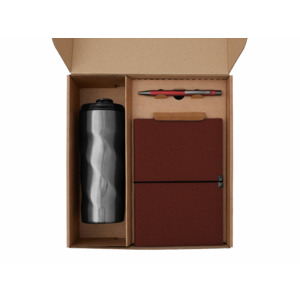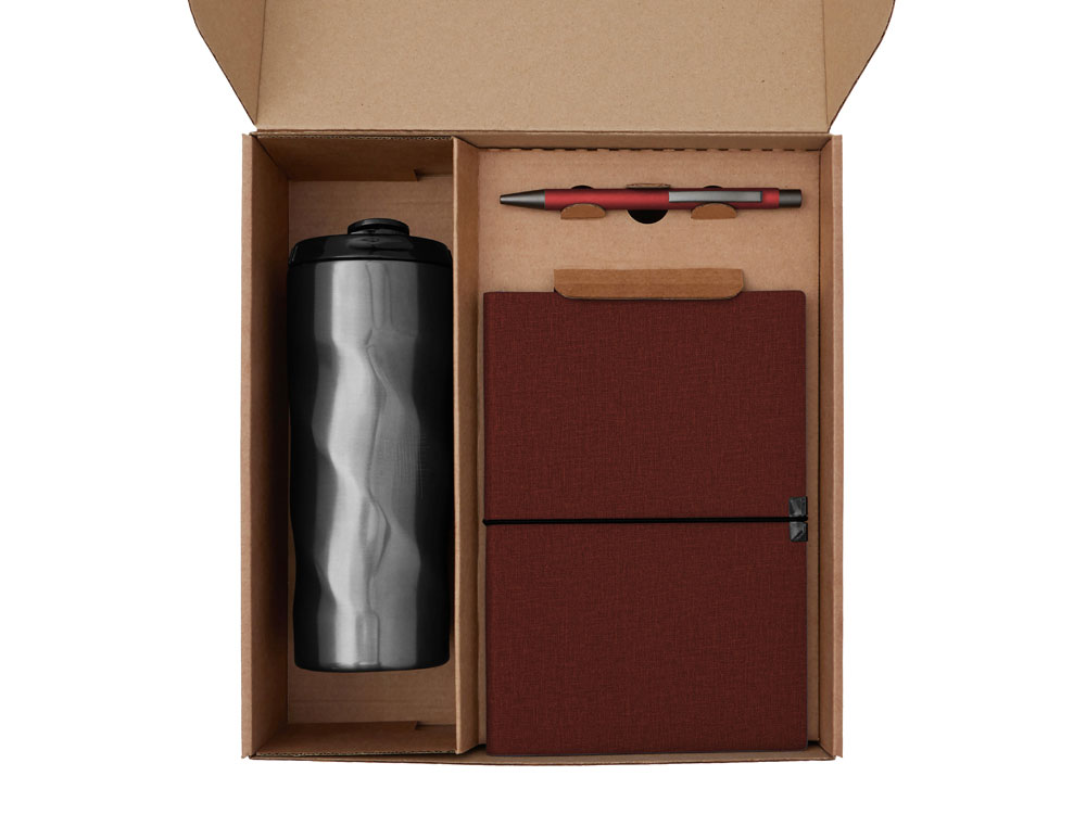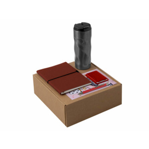 - Материал товара - блокнот- искусственная кожа, бумага, ручка - металл с поверхностью soft-touch, термокружка - кружка- нержавеющая сталь, крышка- пластик, картхолдер - переработанный полиуретан, открытка - бумага, коробка- картон