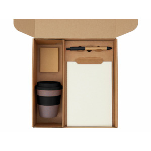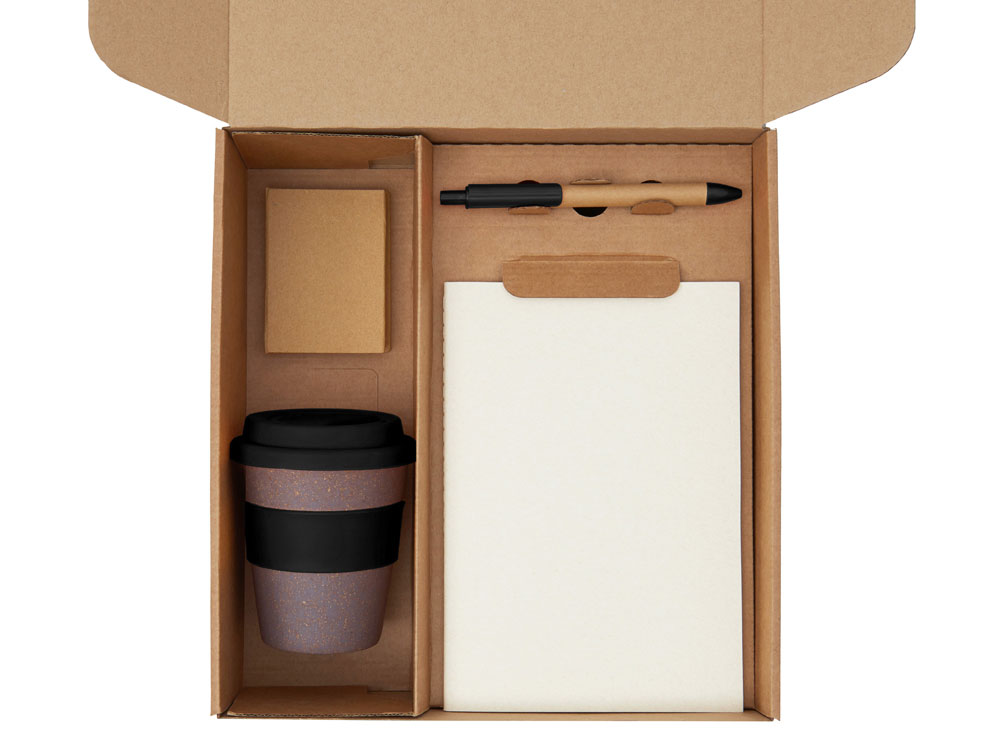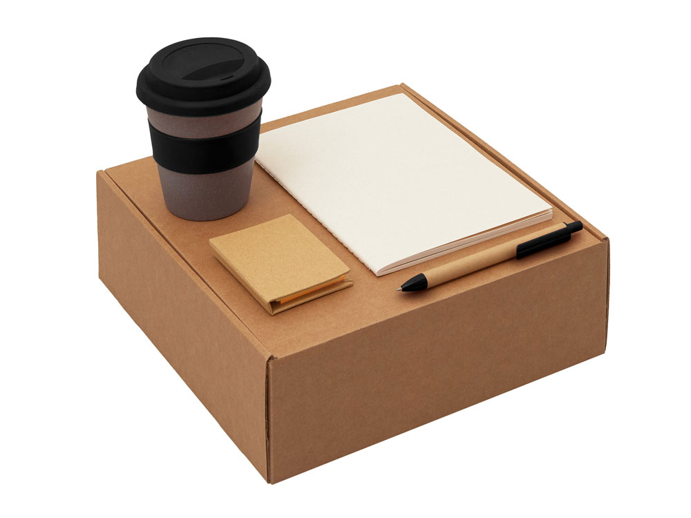 - Материал товара - блокнот- бумага из переработанных тетра-паков, ручка- картон, пластик, стакан- 50% бамбуковое волокно, 50% полипропилен, коробка- картон