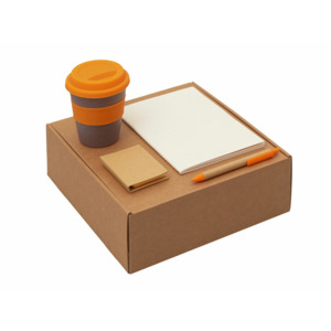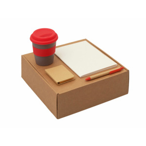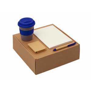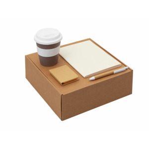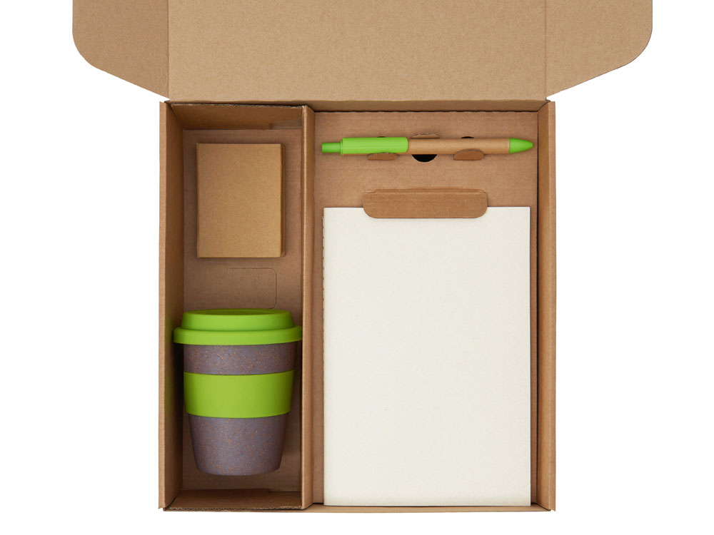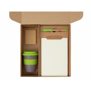 - Материал товара - блокнот- бумага из переработанных тетра-паков, ручка- картон, пластик, стакан- 50% бамбуковое волокно, 50% полипропилен, коробка- картон