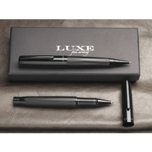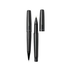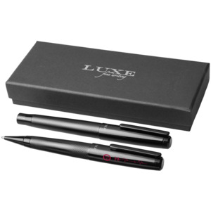 Подарочный набор из двух ручек Gloss. Подарочный набор из шариковой ручки и ручки-роллера с черним колпачком и глянцевым корпусом в подарочной коробке LUXE. Шариковая ручка: 14 см х 1,45 см, вес: 40 г, длина непрерывной линии: 800 м. Ручка-роллер: 13,8 см х 1,45 см, вес: 54 г, длина непрерывной линии: 400 м. Металл.