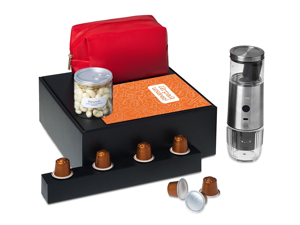 Наборы серии Re: напоминают: важнее всего человек, а не его роль. Они дарят возможность замедлиться и насладиться настоящим. Каждый набор — как мини-ритуал: согреться, почувствовать себя, поблагодарить и восстановиться после дней, полных скорости, дедлайнов и шума. Re:y. — Универсальные наборы для осознанного отдыха, которые помогут отстраниться от информационного шума, замедлиться и подарить себе время на настоящую жизнь и личные моменты счастья. Набор "Re:y. Boost" о бодрости, энергии и маленьких ритуалах, которые можно взять с собой. Портативная кофемашина и кофе в капсулах позволяют приготовить ароматный напиток дома, в офисе или на прогулке. Кешью в глазури добавляет сладкую нотку, а косметичка позволяет взять любимые вещи с собой, куда бы вы ни отправились.. Этот набор превращает привычный утренний ритуал в момент бодрости и комфорта, где бы вы ни были.