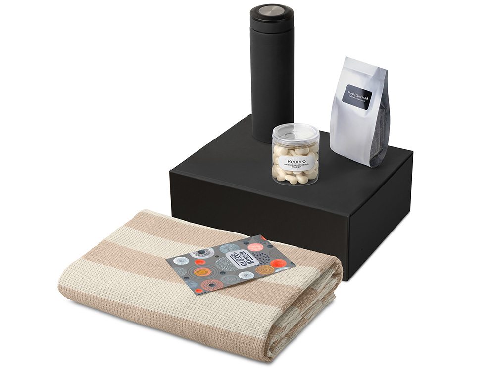 - Материал товара - плед - 100% хлопок, термос - нержаваеющая сталь с покрытием soft-touch, чай - пластик, мешок - нетканый материал (спанбонд), коробка - картон