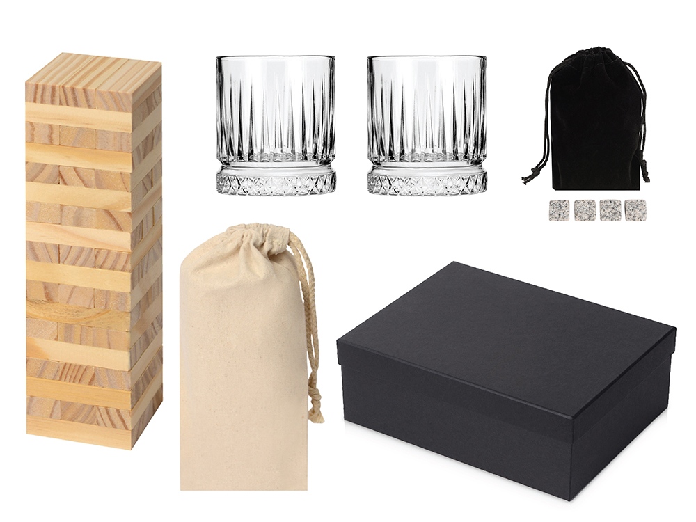 Подарочный набор с бокалами, камнями для виски и дженгой. Набор отлично подойдёт для приятного отдыха с друзьями за весёлой игрой. Популярная настольная игра "Tower 54" состоит из 54 брусков, выполненных из древесины сосны. Задача участников состоит в том, чтобы по очереди доставать блоки из основания и перекладывать их в верхнюю часть башни. Захватывающая игра, каждая партия которой будет уникальна, может проводится как в кооперативном режиме, так и в индивидуальном. Камни для виски не тают, в отличие от льда, а также охлаждают напиток в течение более длительного времени. Камни подойдут и для любого другого напитка. Поставляются в бархатном мешочке на завязках, на который можно нанести логотип компании. В наборе 4 шт. Толстое дно стеклянного бокала препятствует быстрому нагреванию. Рельеф напоминает огранку драгоценного камня и особенно эффектно проявляется, когда бокал заполнен. - игра упакована в собственный хлопковый мешочек; - бокалы можно мыть в посудомоечной машине; - классический объём бокала 210 мл; - подарочная коробка с наполнителем входит в набор.
