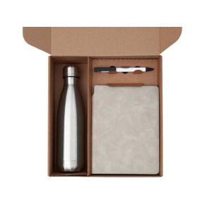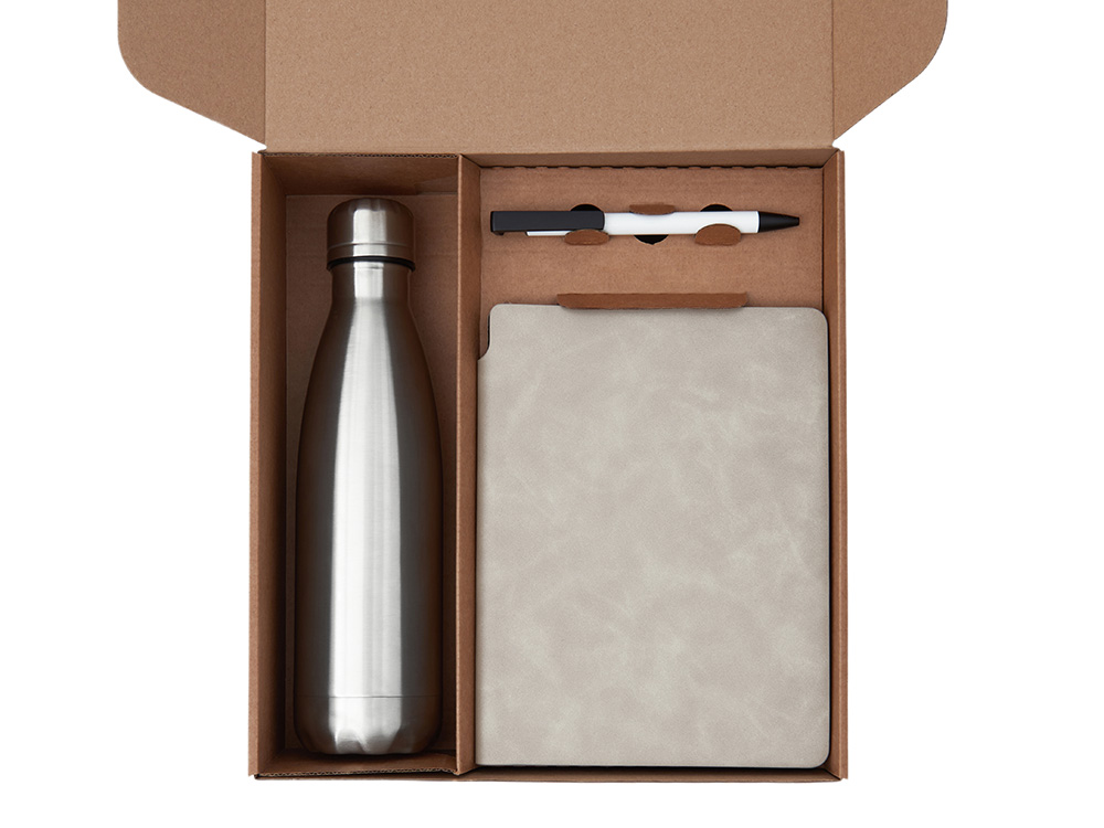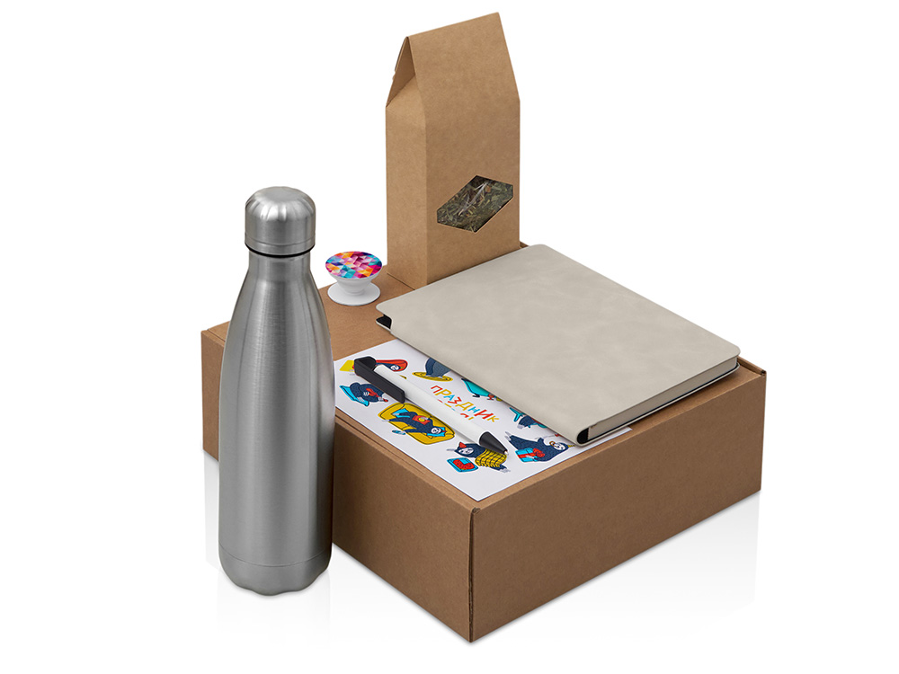 - Материал товара - бутылка - нержавеющая сталь, ручка - металл, пластик, блокнот- полиуретан, FSC бумага, держатель для телефона - пластик, чай - крафт-пакет, коробка - картон