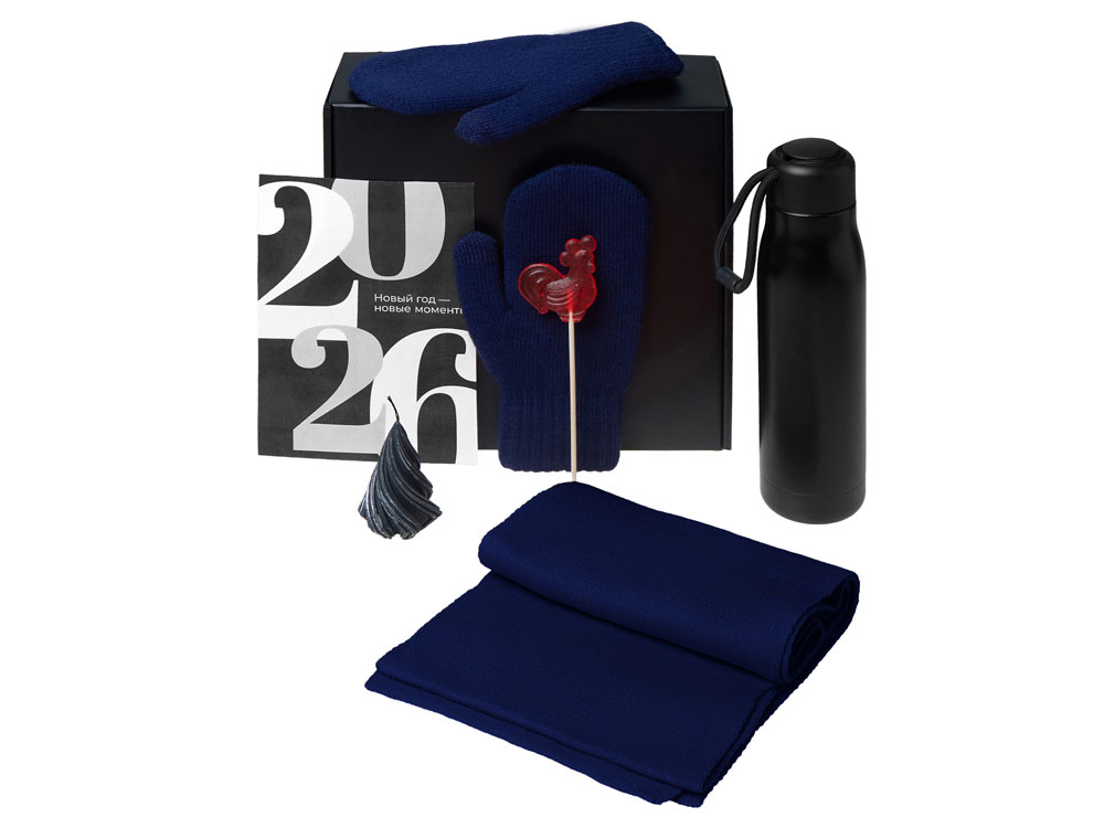 Подарочный набор с варежками, шарфом и термосом, темно-синий