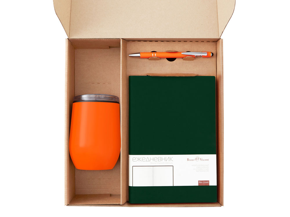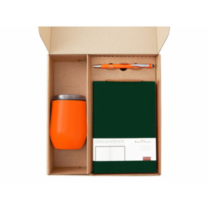 - Материал товара - ежедневник - искусственная кожа, термокружка - нержавеющая сталь снаружи, полипропилен внутри, ручка - металл c покрытием soft-touch, ситечко - нержавеющая cталь