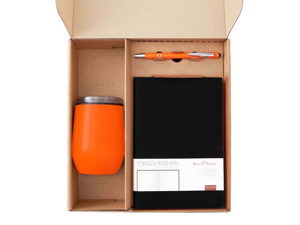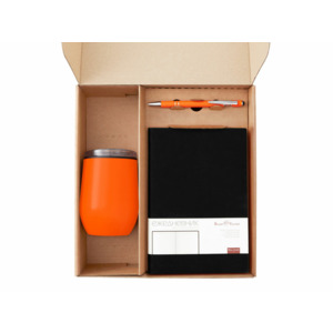 - Материал товара - ежедневник - искусственная кожа, термокружка - нержавеющая сталь снаружи, полипропилен внутри, ручка - металл c покрытием soft-touch, ситечко - нержавеющая cталь