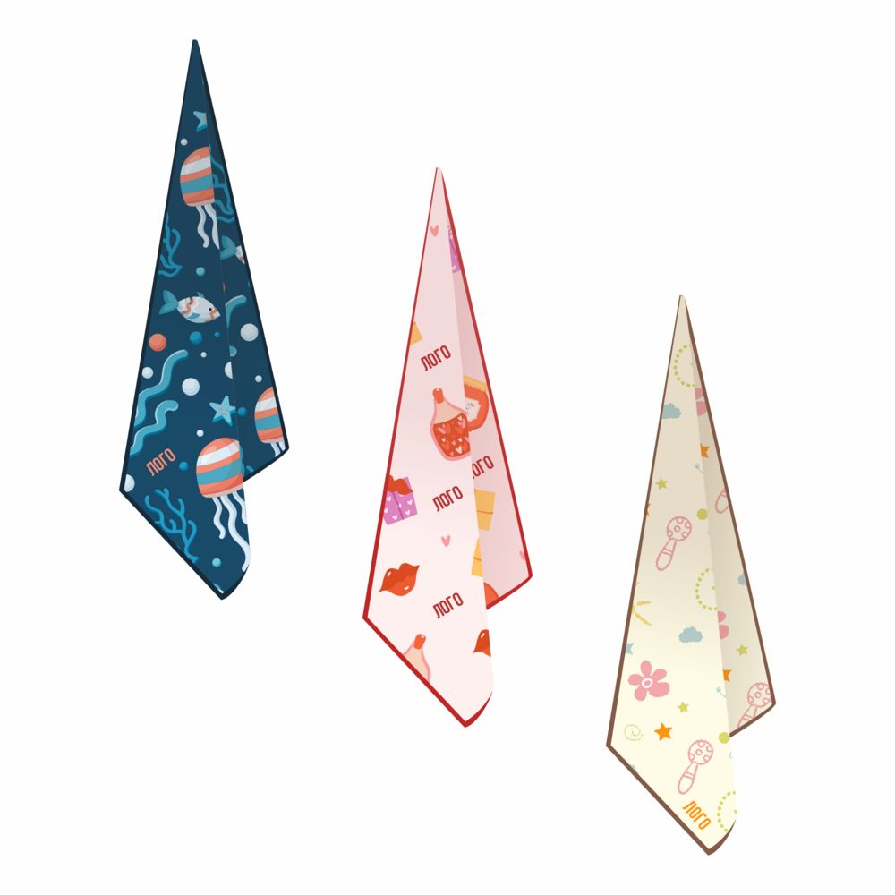 Лицевая сторона полотенца похожа на велюр. Синтетическое полотно и короткостриженые петельки позволяют нанести полноцветное изображение методом сублимационной печати. Оборотная сторона выполнена из натурального хлопка и выглядит как обычное махровое полотенце. Она хорошо впитывает воду и приятна к телу. Края полотенца обработаны подгибкой.