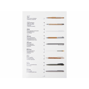 Промо-сет ЭКО ручек — это презентационный комплект, включающий 9 уникальных моделей с несколькими вариантами нанесения: УФ-печать, тампопечать. В сете представлены самые хитовые позиции категории ЭКО, а также новинки каталога периода зима-весна 2026 года. Все образцы аккуратно закреплены на стильной картонной подложке при помощи резинового фиксатора. На обратной стороне указаны названия и краткое описание моделей. Промо-набор — идеальный инструмент для презентаций: клиенты могут подержать ручки в руках, опробовать их на письме и наглядно увидеть различия между видами нанесения. При этом все самые важные модели собраны в одном легком и компактном наборе.
