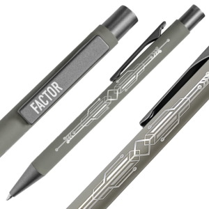 Модель ручки FACTOR – это оптимальный выбор для тех, кто предпочитает добротное качество, надежность и изящную простоту. Этой ручкой писать легко и удобно, она буквально скользит по бумаге благодаря качественным чернилам и надежному пишущему узлу. Все эти качества позволят ручке служить вам верой и правдой долгое время. А клип и корпус данной модели отлично подойдут для нанесения вашего логотипа. • Pantone, близкий к Cool Gray 8 C• Размер 140*10 мм• Корпус из алюминия с покрытием soft touch• Металлический клип-прищепка серого цвета • Пластиковые носик и кнопка в цвет клипа• Нажимной механизм подачи стержня• Пулевидный пишущий узел 1.0 мм• Длина линии письма 1000 м • Чернила Dokumental. Цвет чернил синий• Сменный стержень Parker type• При гравировке вскрывается натуральный цвет алюминия, который может быть либо более белый, либо более серого оттенка.